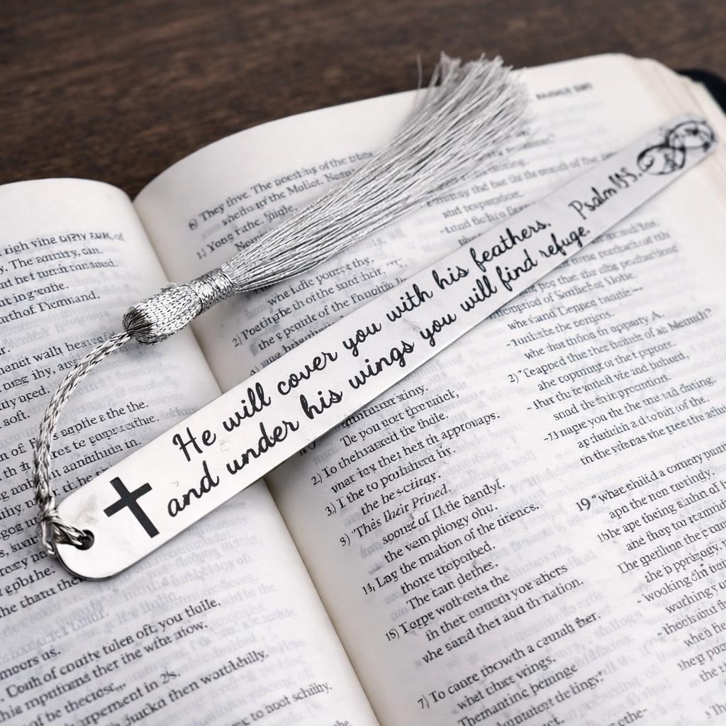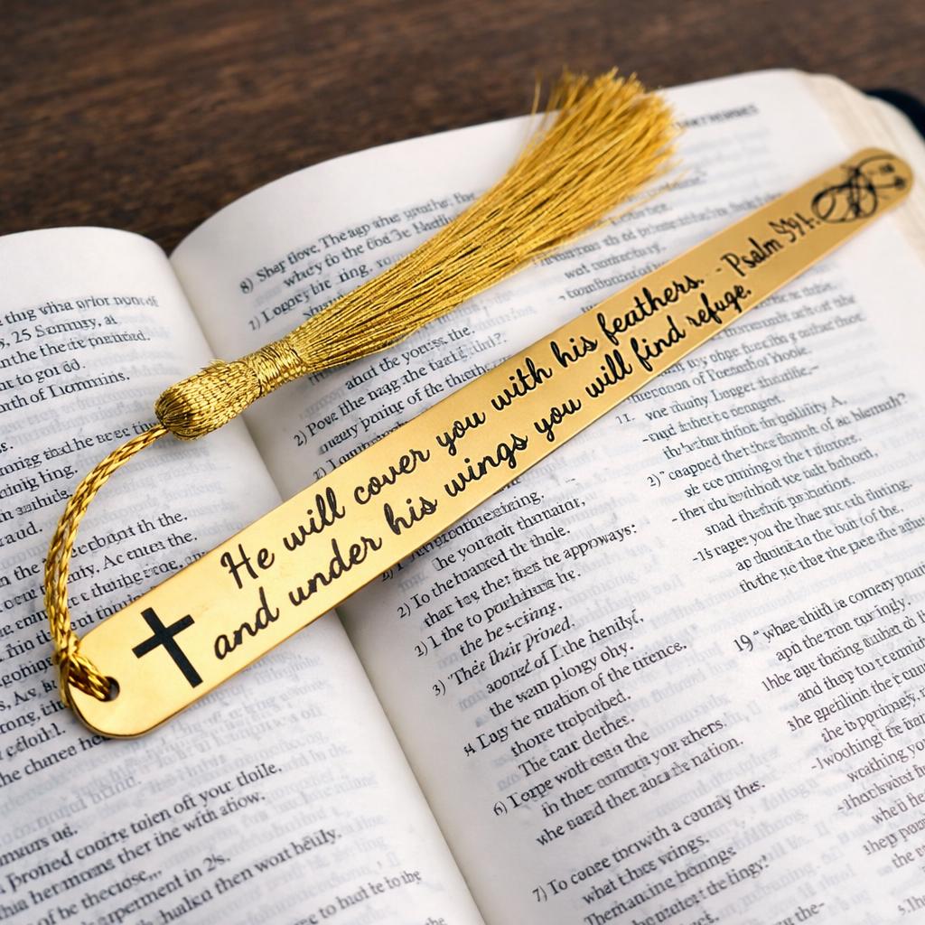 PSALM 91:4 He will cover you with his feathers and under his wings you will find refuge Bookmark Gifts. Christian Bible gift.
