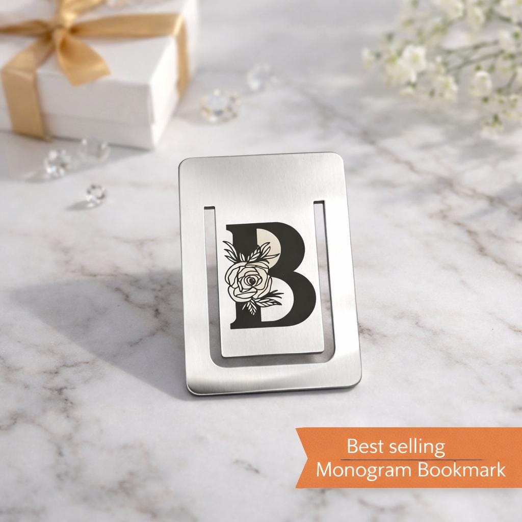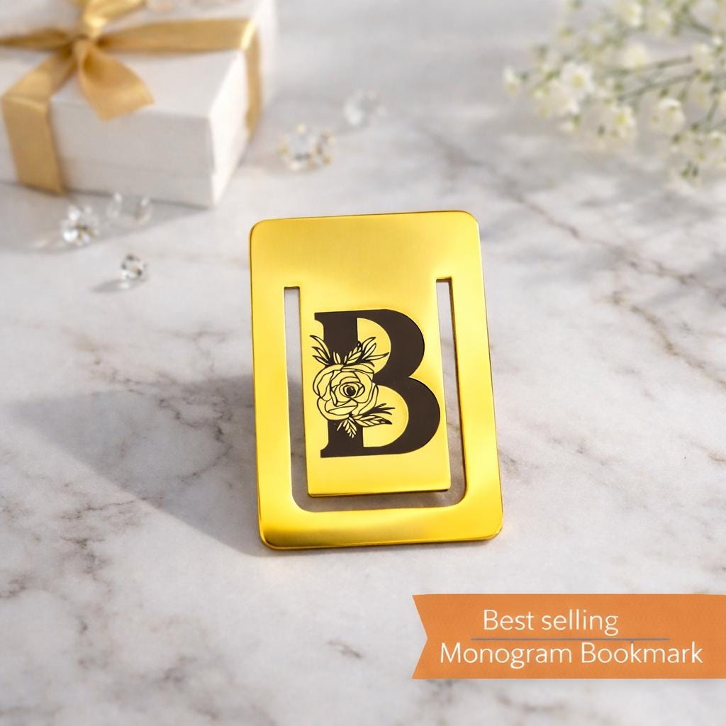Personalized Monogram Bookmark. Custom Initials Engraving on Gold Tone Bookmark.